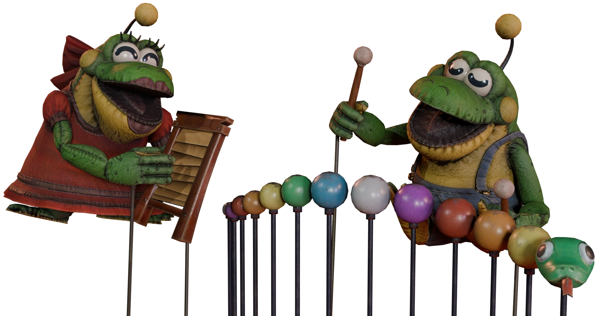 The Jugband Frogs are a duo of Frog animatronics who play different instruments in the Jugband. Both of them are small green frogs with undersides, as well as yellow on the soles of their feet, their palms, and on their cheeks. Both of them also have small antenna on the tops of their heads with a yellow ball at the end of it.