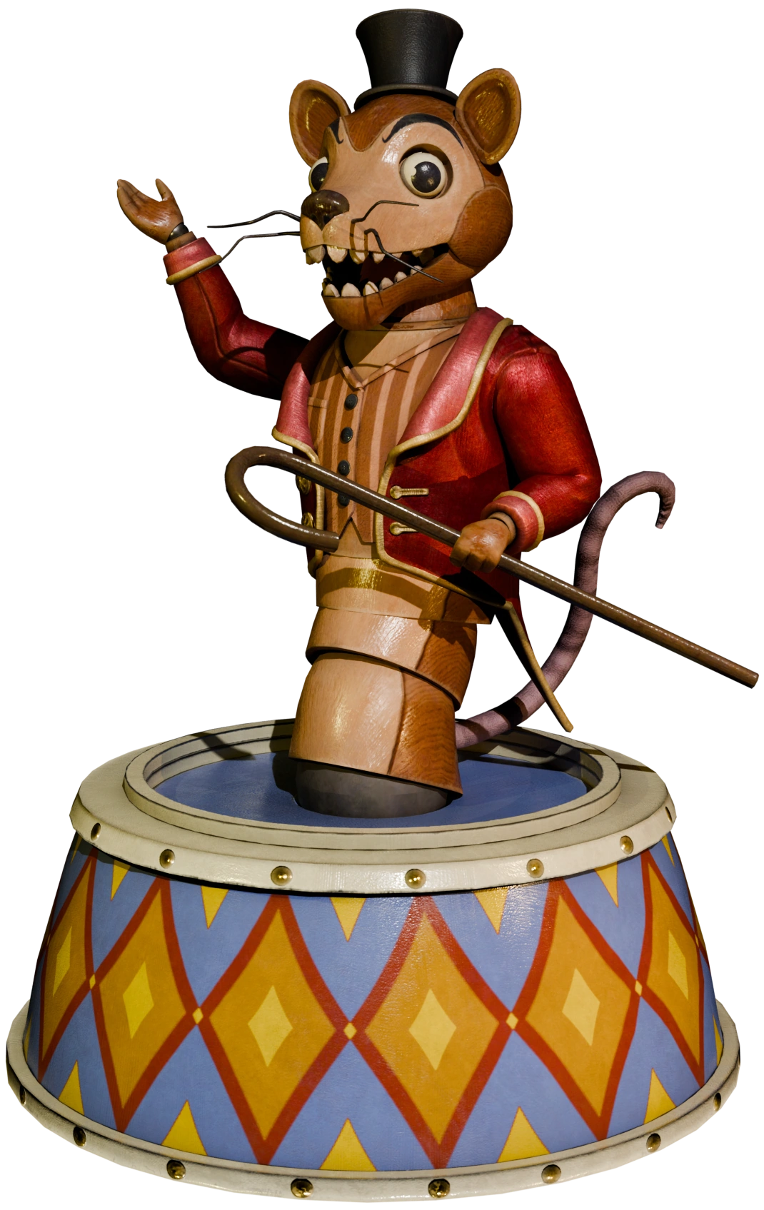 Ringmaster Rat is an unused member of the Welcome Show, only appearing as a prop in different rooms in-game, with his role being usurped by the Helpfuls. Ringmaster Rat is a brown, wooden rat animatronic with a sly expression and a body identical to that of the Helpfuls. His face and stomach are mostly tan, he has long spindly whiskers, and he has a long thin pink tail curled upwards. He wears a red showman's jacket with gold trimming and buttons, and a two-toned brown striped vest underneath. Finally, he wears a small black tophat and holds a long brown cane.