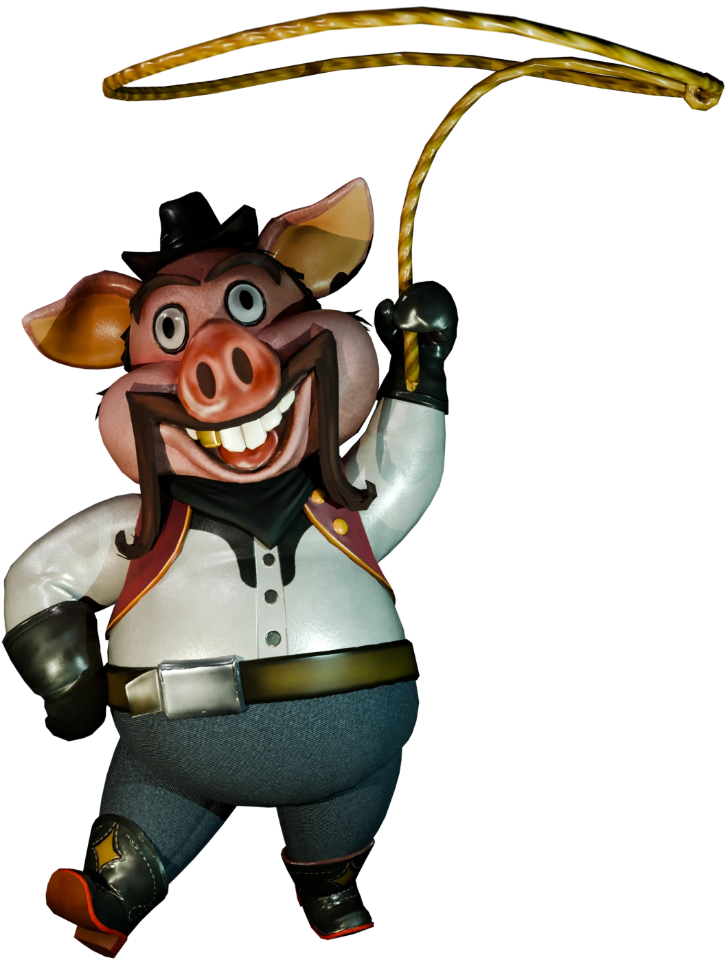 Lasso Pig is a cowboy animatronic who stands as a part of the Circus crew. Lasso Pig is a cartoon pig dressed as a cowboy, wearing a small black cowboy hat, a black bandana around his neck, white button-up shirt with a red leather vest, blue jeans, and a combo of matching black leather gloves and belt. He also wears black cowboy boots with red soles and a small yellow star stitched onto the front of them. He has a small curly pig's tail, and a chubby frame. Lasso Pig's face, stuck in a permanent open-mouthed smile, holds large cheeks, large ears, small eyes and a big pig snout. He holds bushy brown eyebrows, messy brown hair on only the sides of his head, and a large handlebar mustache. He also has one gold tooth in his permanently open smile. Finally, Lasso Pig, true to his name, holds a large rope lasso, which he swings around whilst balancing on one foot during performances.