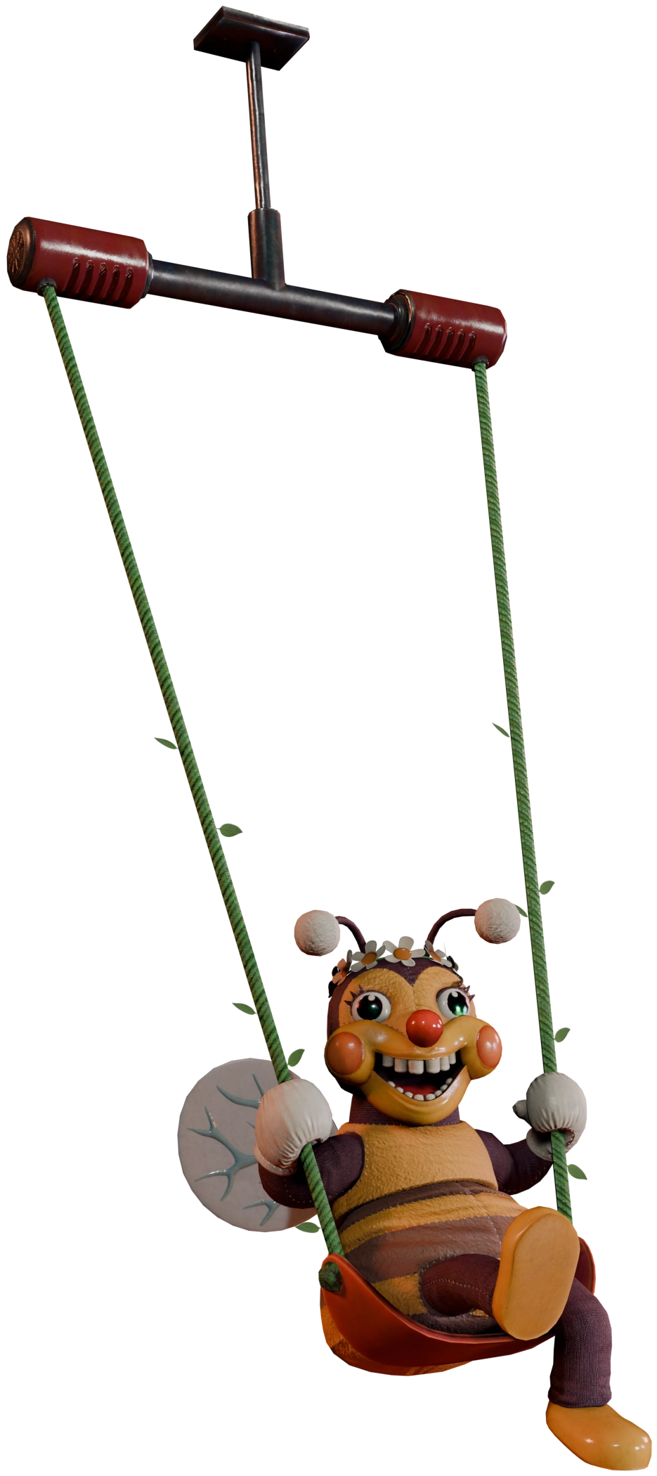 Swing Bee is one of two members of the Demo-tronic Welcome Show to also be a mascot suit wearable by the Mimic. In their mascot form, Swing Bee has two variants based on a ladybug and caterpillar respectively. As well as them, the actual Swing Bee animatronic suit has two variants that can be found as props. The first is a mostly red variant that also has dark purple stripes and limbs, a light green nose, tongue and cheeks, pink balls on the antenna, and no flower crown. The second is a blue variant, being mostly blue with dark blue limbs, teal stripes, an orange nose, tongue and cheeks, and once again, no flower crown. This variation is unique as it only appears in one spot above the performer entrance to the pirate puppet show theater. While neither variant has a crown, they do hold textures for unique flower crowns, with the blue one having a purple flower, and the red one having a dark pink flower.