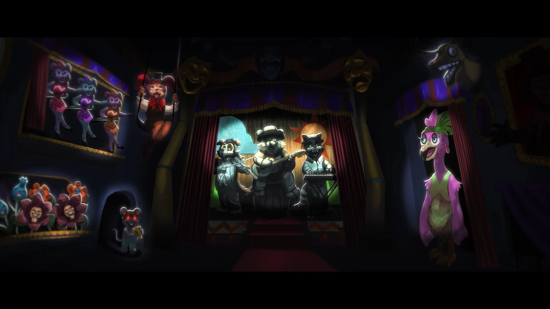 Early concept art for the Welcome Show showcases a vastly different cast of characters, and a notably smaller set at that. Originally, the centerpiece of the show would have been three large animatronics; a dog playing the violin, a raccoon playing a keyboard, and in the center, a large bear playing the guitar. To one side of the stage with the three animatronics would have been a small mouse character with a bit of cheese, three identical dancing bear women, and early versions of the flower character cutouts and Swing Bee, who originally was a brown mammalian character with pigtails reminiscent of Circus Baby. On the other side of the stage are notably fewer characters, being a flamingo flamenco dancer, an earlier version of the Stanley head found in Edwin Murray's office, and a portrait style animatronic clown just barely viewable to the upper lefthand side of the flamingo.