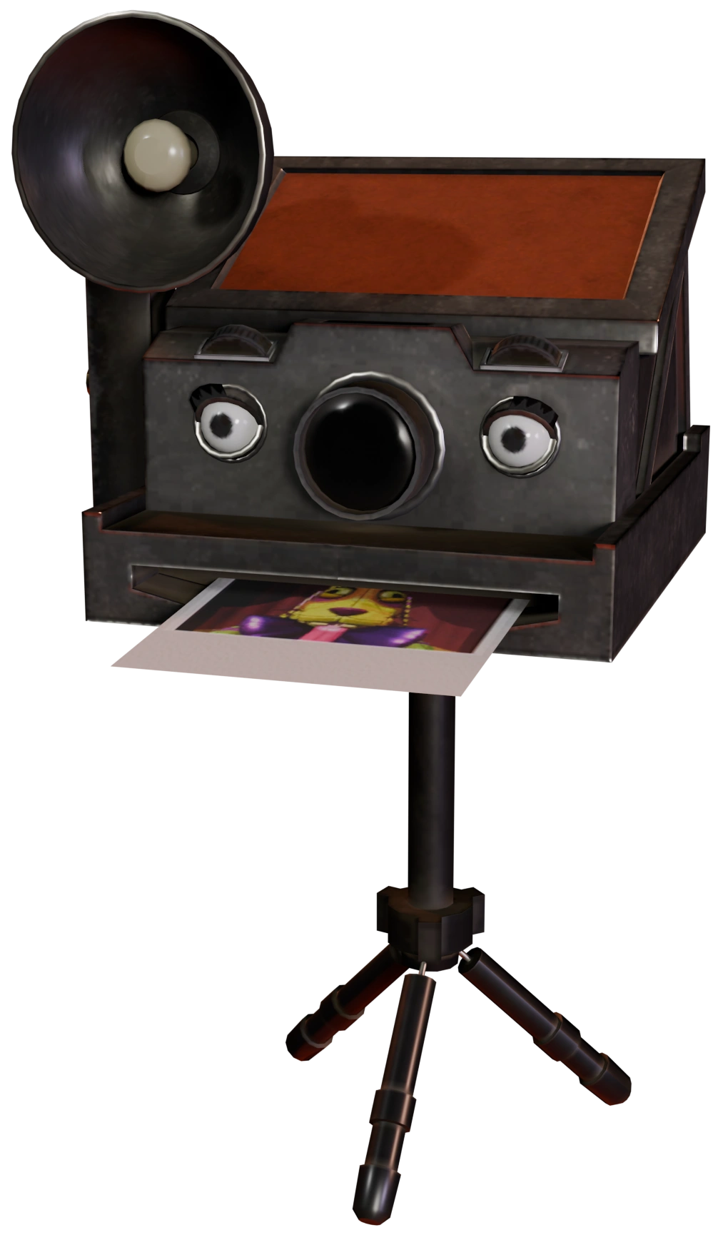 The Welcome Show Camera is a small camera animatronic found at the very entrance of the Welcome Show room. It is a large polaroid camera with small white eyes and a mouth dispensing a polaroid photo of Birthday Puppy. It has a large flashbulb attached to its right side, and a black tripod that it sits atop. It is the only animatronic in the room to remain entirely motionless, aside from the photo in its mouth moving in and out constantly. At the end of the show, the photo fully comes out and remains sitting in-place in the camera's mouth.