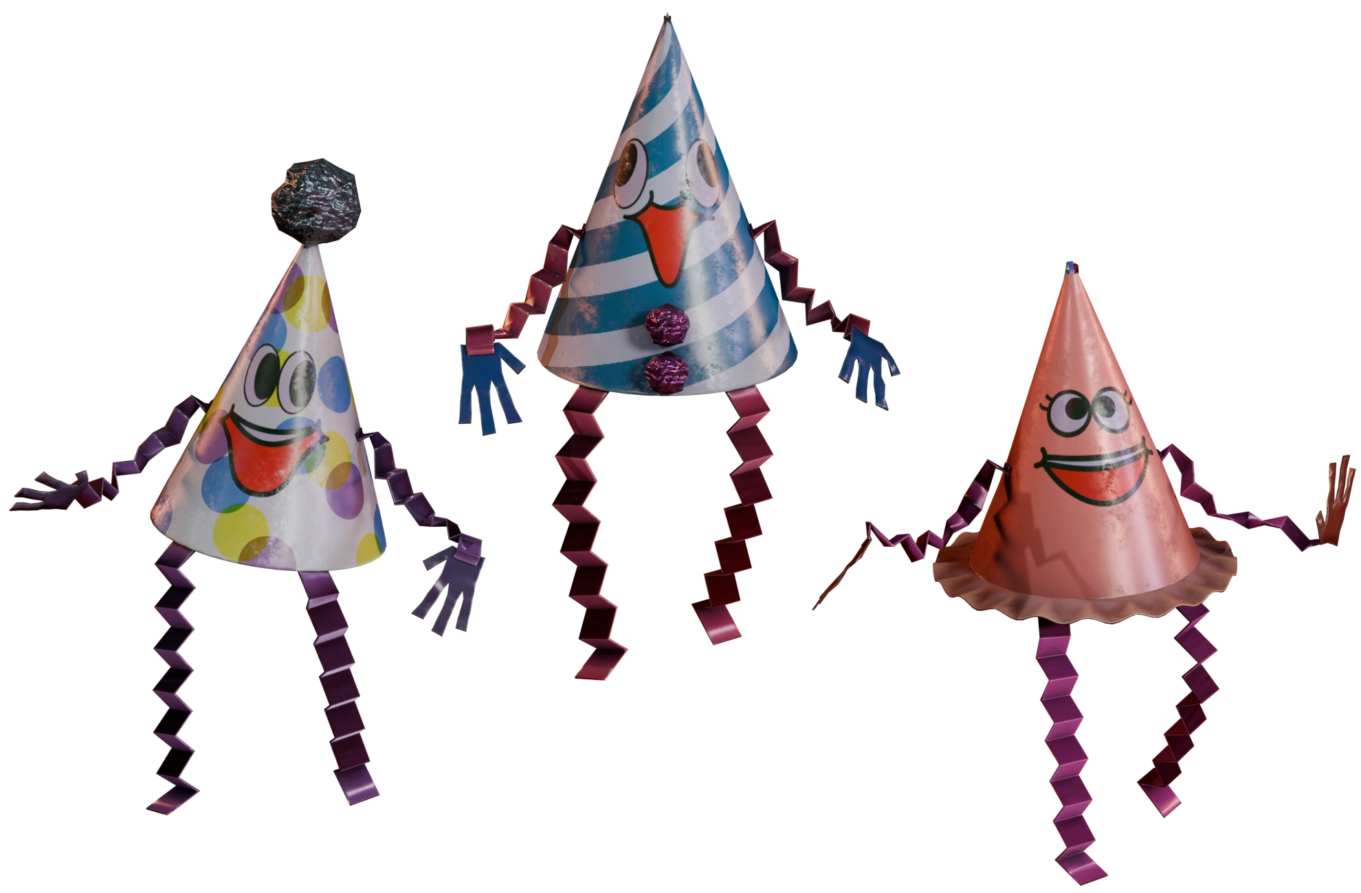 The Birthday Hats are a set of party hat "animatronics" who appear along the cake in the Welcome Show's birthday section. They all appear as cone-shaped party hats with crinkled up paper for limbs, and shiny cut-out paper hands. While there is a large number of party hats, they only come in three different variations. The first variation holds blue and white diagonal stripes going along its cone body, with dark pink limbs and blue hands. It has a derpy face with its eyes pointed in different directions, and two shiny purple pom-poms on its chest. The second variation is a white party hat with overlapping purple, blue and yellow polka dots, and purple limbs and hands. It holds a large smiley face with its eyes looking to the left, and a large dark teal, almost black-colored, pom-pom on its top. The final variation is entirely a salmon-pink with dark pink limbs and red hands. It holds a generic open-mouthed smiley face, and a crinkly tutu around the bottom of its cone body.