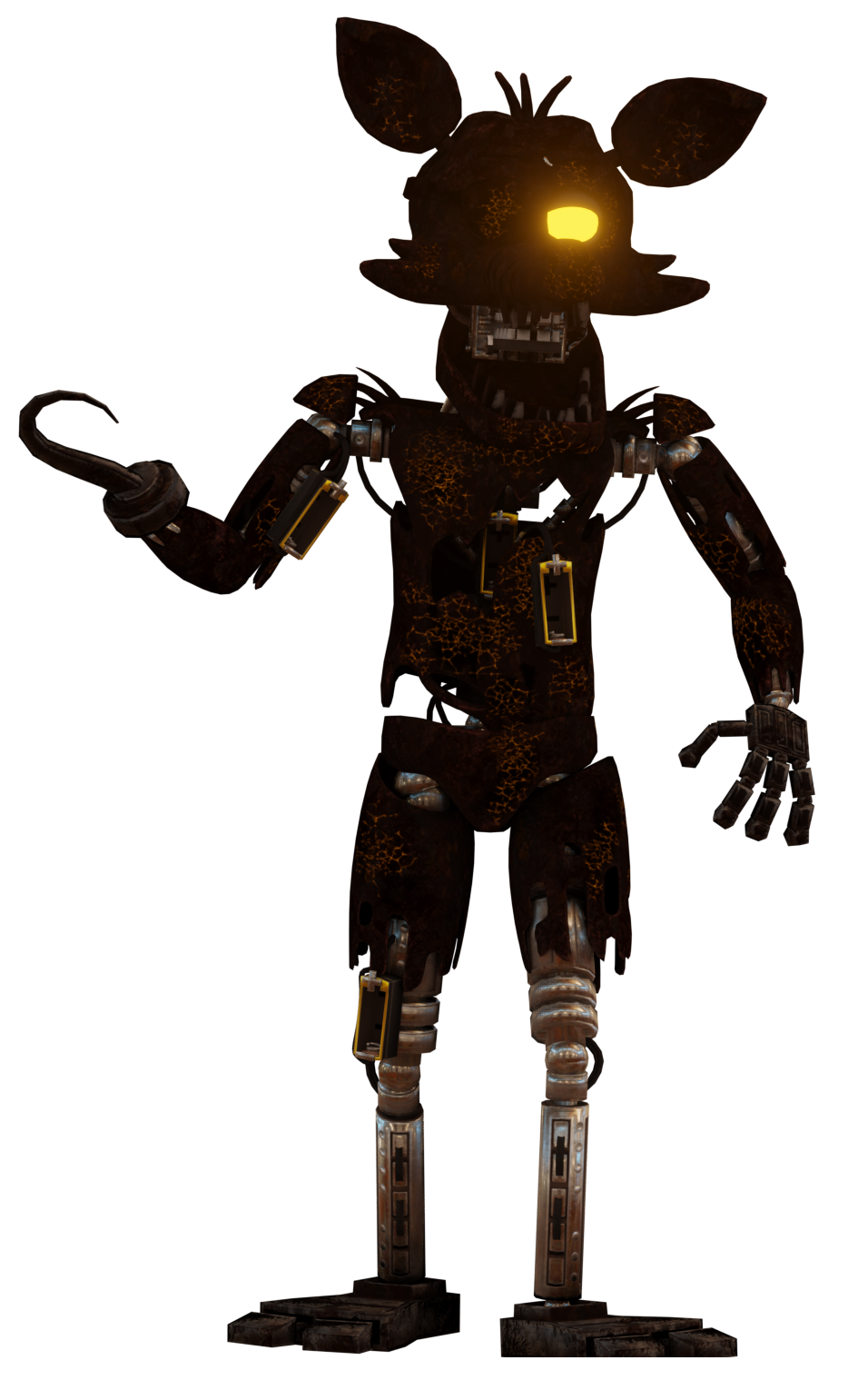 Burnt Foxy is a brown-colored animatronic with a course texture. His suit is covered in glowing orange cracks which match his glowing orange eyes. Parts of his endoskeleton, particularly his hands and feet, also display a burnt appearance, being substantially darker than the other parts of his endoskeleton.