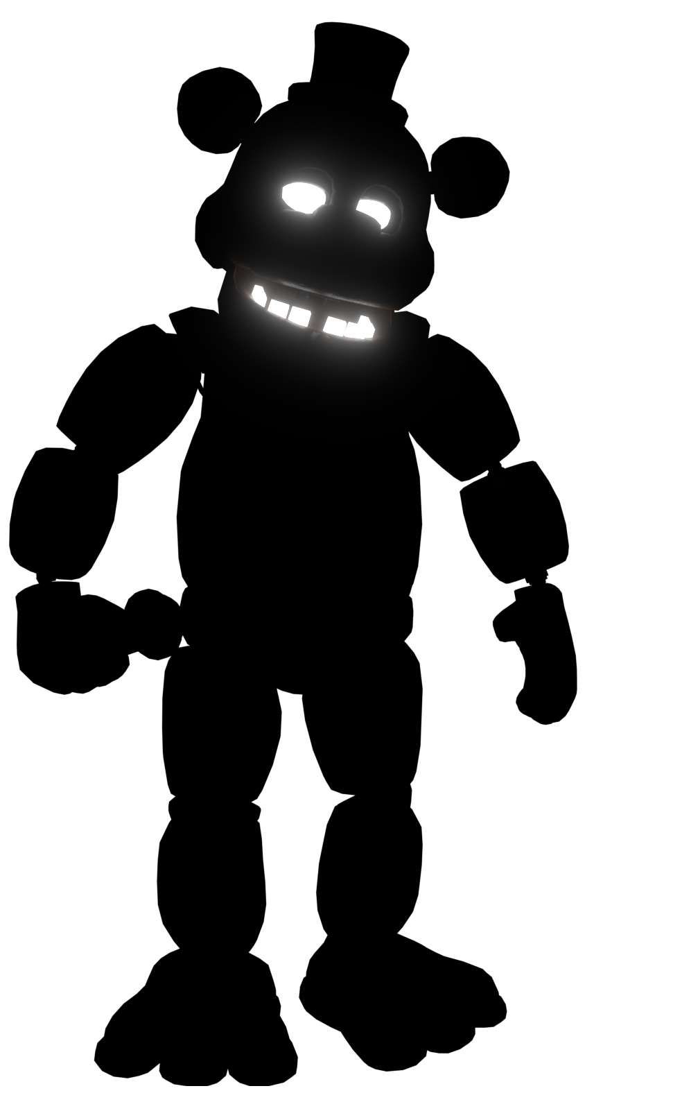 Dark Freddy is entirely black in color with glowing white eyes and teeth, having a design that is overall reminiscent of RWQFSFASXC. Party Freddy is virtually the same, albeit with the eyes and teeth now being black with red glows rather than Dark Freddy's white glow. In the Full Time edition of Help Wanted, Dark Freddy is strangely a normal, white-colored Freddy with a black bowtie rather than a shadowy black version of the character. He still keeps the glowing eyes and teeth in this version, however.