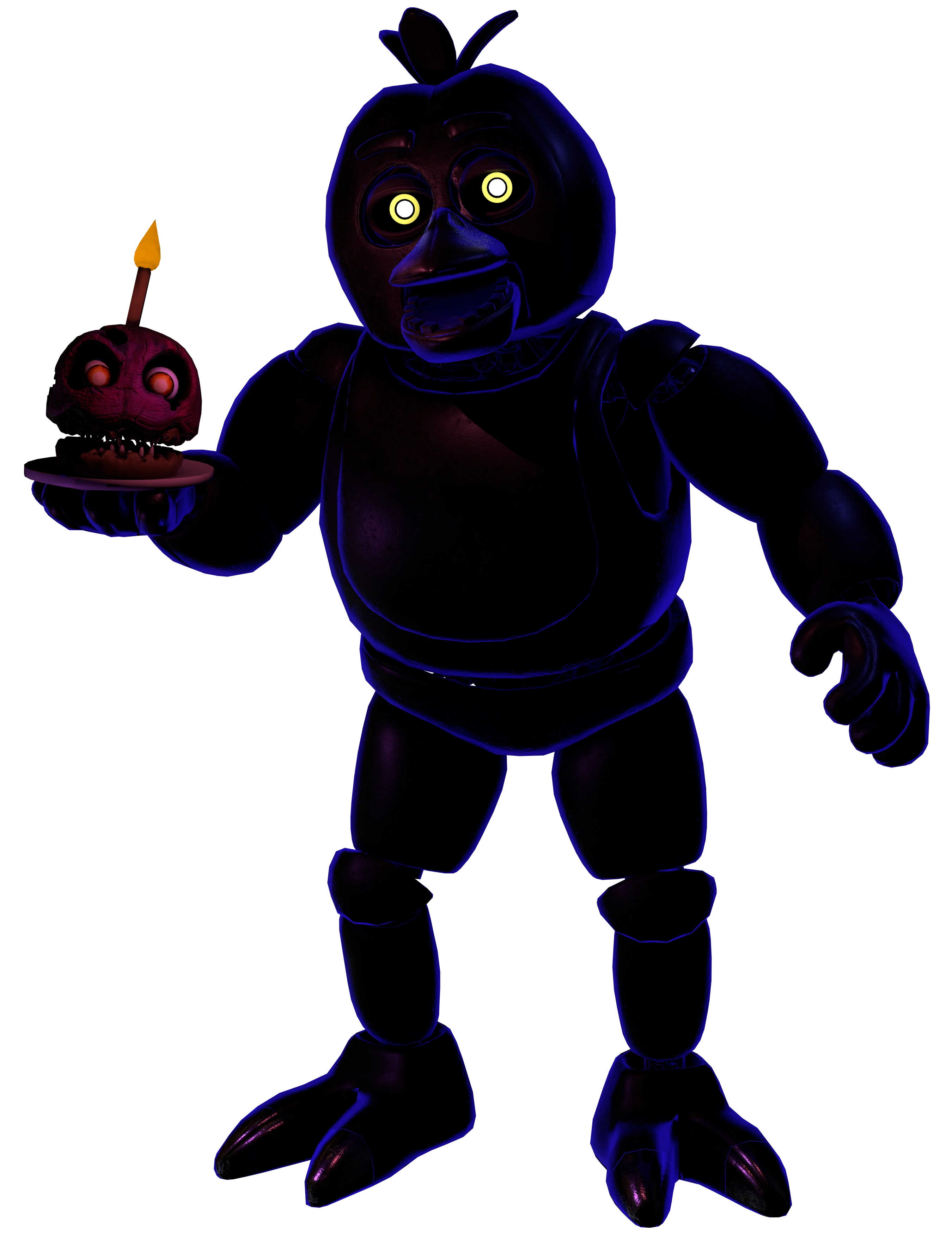 Neon Chica holds the same model as Classic Chica, however she is entirely dark in color with a faint purple edge. Her eyes are black in color with white pupils and yellow irises. She is often accompanied by Nightmare Cupcake, who due to the level's lighting appears purple and orange.