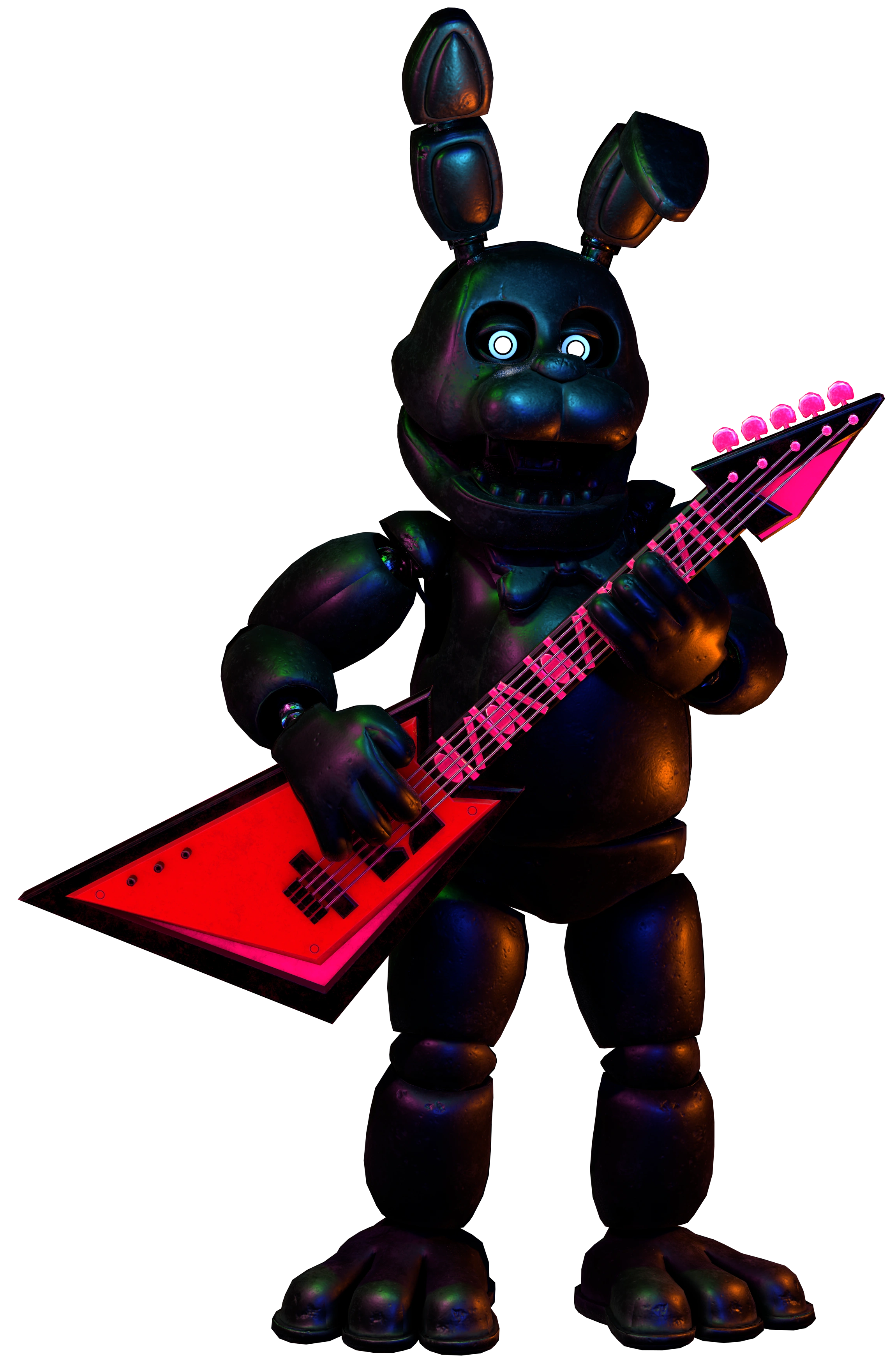 Neon Bonnie is identical to Bonnie, however he holds a metallic black texture that appears multi-colored under the level's constantly moving lights. He has black eyes with white pupils and blue irises.