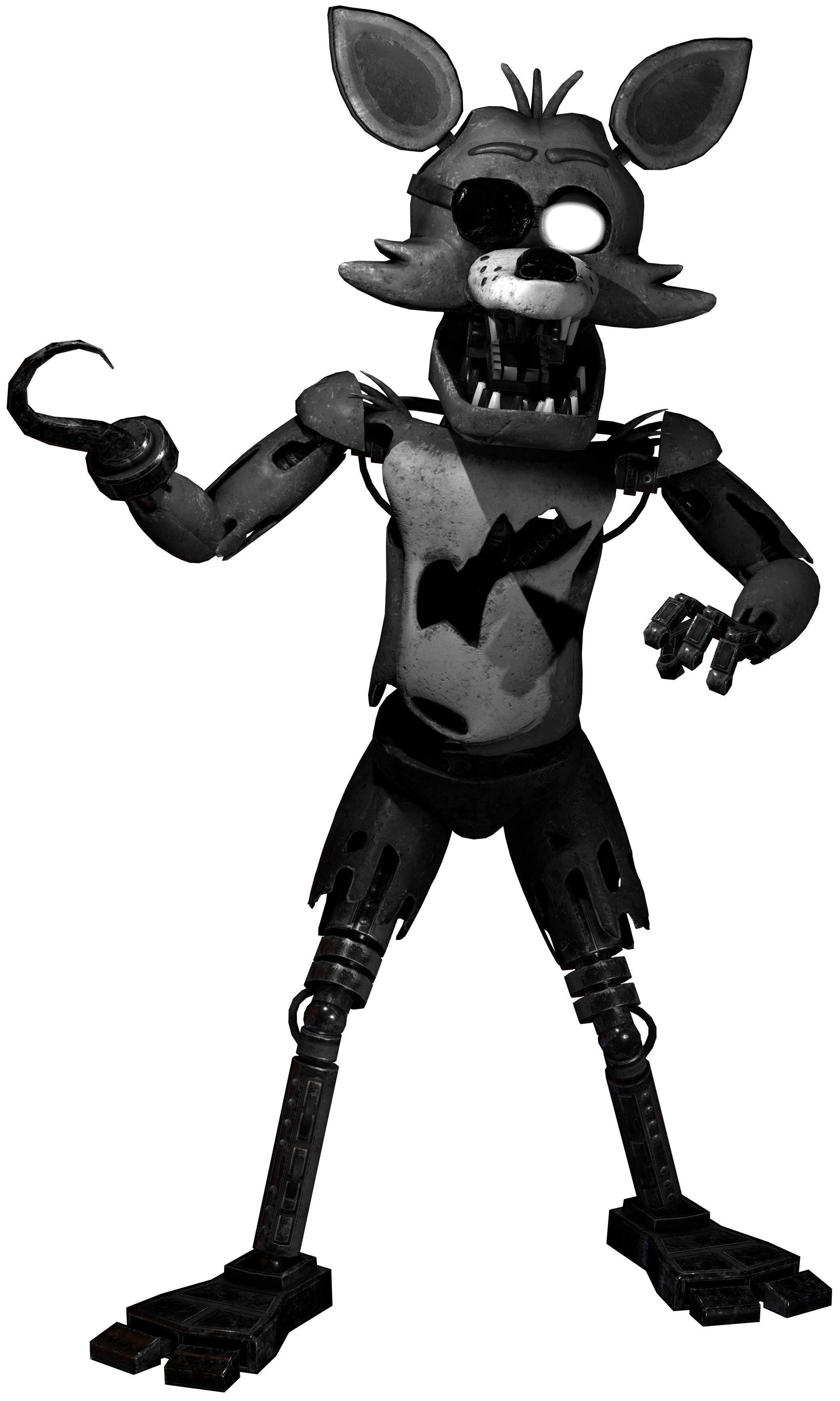 Dark Foxy is entirely identical to Foxy, apart from the glowing white eye. He gets his name from the black and white filter put onto the Five Nights at Freddy's 1's Night 5 level. Foxy's jumpscare in the level would later be changed in the flatmode update, making Dark Foxy a black and white version of Burnt Foxy rather than Classic Foxy.