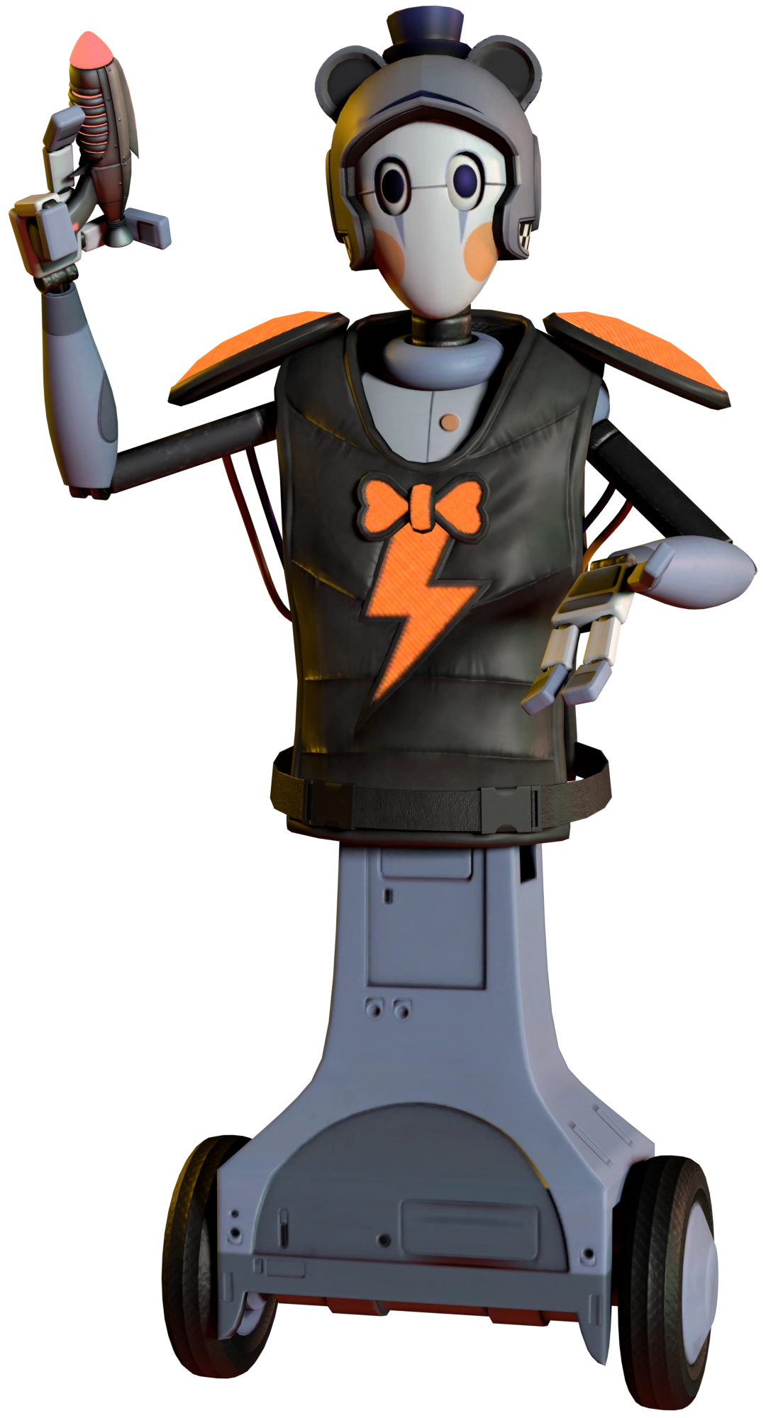 The Instructor Bot appears as a standard S.T.A.F.F. Bot, albeit wearing a large laser-tag vest and gray helmet. The vest holds an orange glowing version of Glamrock Freddy's lightning bolt insignia on its chest, and glowing orange shoulder pads. The helmet it wears is also styled to appear as Freddy, having a small top hat and bear ears on it. It holds a Fazerblaster at all times, and stays up on a stage informing the player on the rules of Fazer Blast and how to put on their equipment properly.