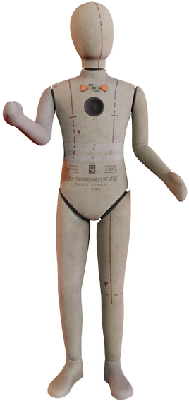 The Mannequins are extremely simple in appearance, being exactly what they are named; mannequins. They are humanoid animatronics with white foam bodies that have begun to yellow from age, and have extremely simple metallic joints on their necks, shoulders, pelvis and ankles to allow for minimal movements. On their chests, they have the MCM logo between two glowing orange triangles emulating a bowtie, and below that is a large gray speaker. Their face, shoulders, torso and right leg all feature red and blue dotted lines and arrows going along them vertically. Along their stomach area are two white strips that wrap around their torsos. Below the white strips are multiple row of gray text. The first row reads "BOY / GIRL" on the right, "MODEL 9" in the center, and "1972" on the left. The second row reads "USA STANDARD MEASUREMENT," with the row below that holds what seems to be a serial number reading "TDS-UT8 134754ALF2." The final bit of text just below the serial number is the number "#1979." Finally, at certain points on their torsos, the Mannequins have small silver nails embedded within them, with only the nail head visible.