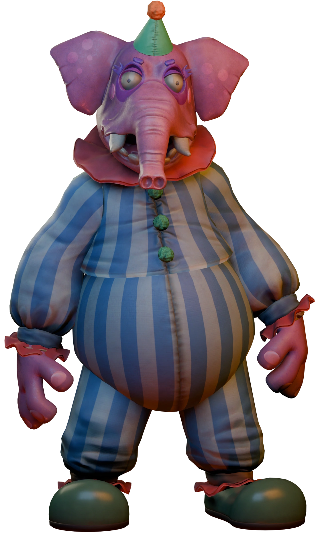The Elephant's orange variation takes on an appearance clearly based on Orville Elephant, a character from Freddy Fazbear's Pizzeria Simulator. This variation takes on bright orange skin, blue eyes, and a dark orange suit covered in shiny yellow stars. It also wears a purple party hat with a white stripe near the bottom of it, and its frilled cuffs are a bright pink with purple trims.