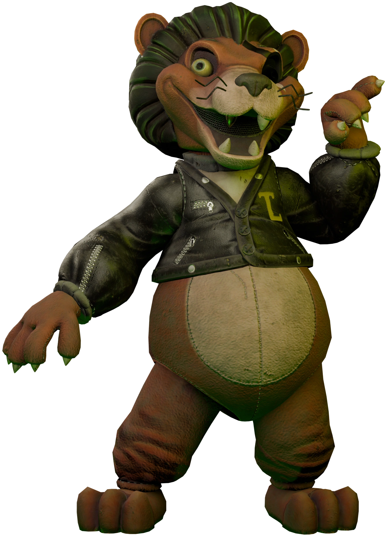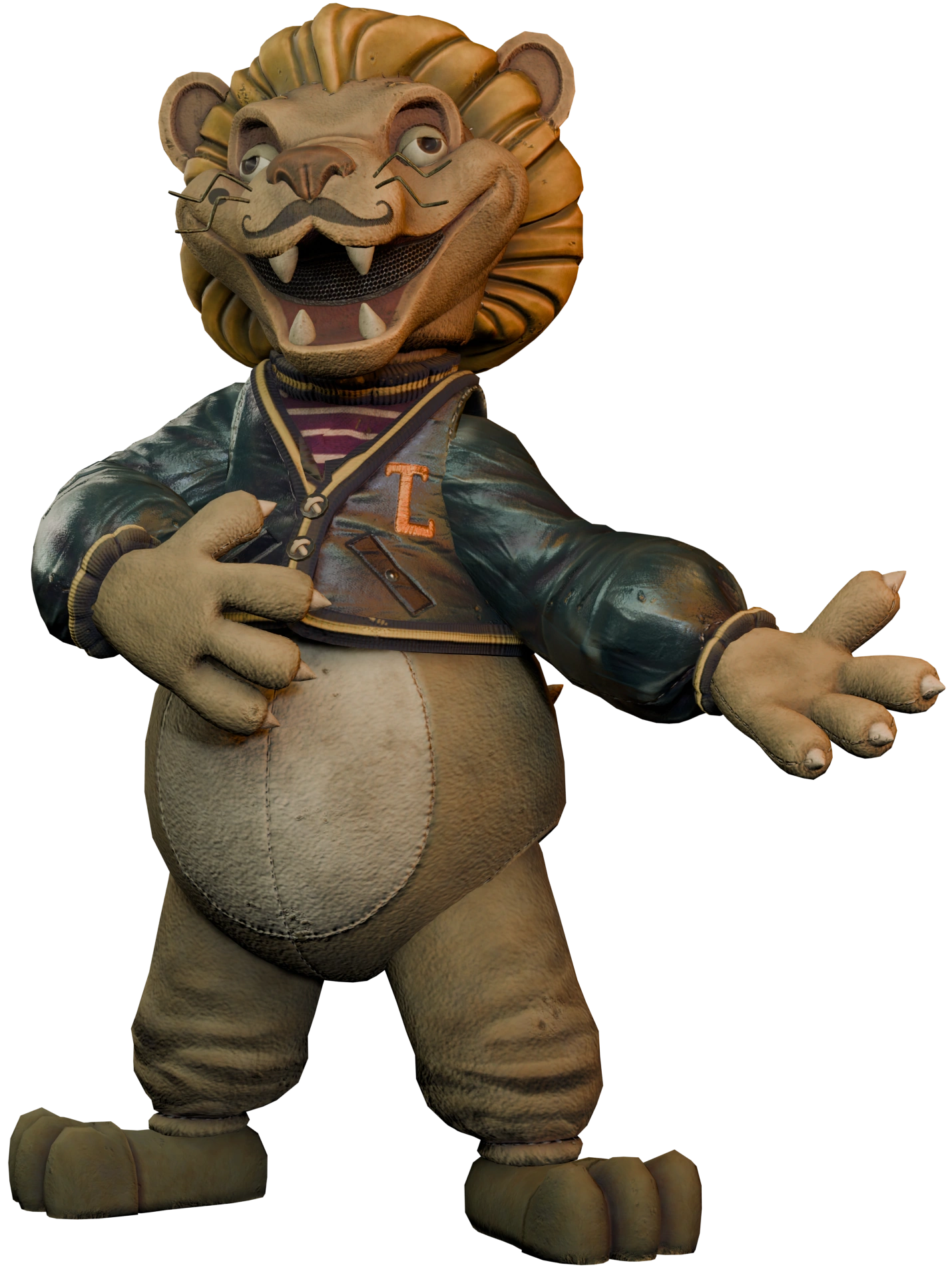 Of the three RUIN mascots, the lion receives the most drastic redesign, most notably in the damaged variant. Much like the other RUIN costumes, the Lion's design is that of the default one in Secret of the Mimic, but with an older model and a dirty appearance. However, in RUIN, the Lion very notably has a very large gash across his stomach, which later has wires pouring out in the amalgamated suit Mimic wears. This gash is entirely absent in the Secret of the Mimic variation.