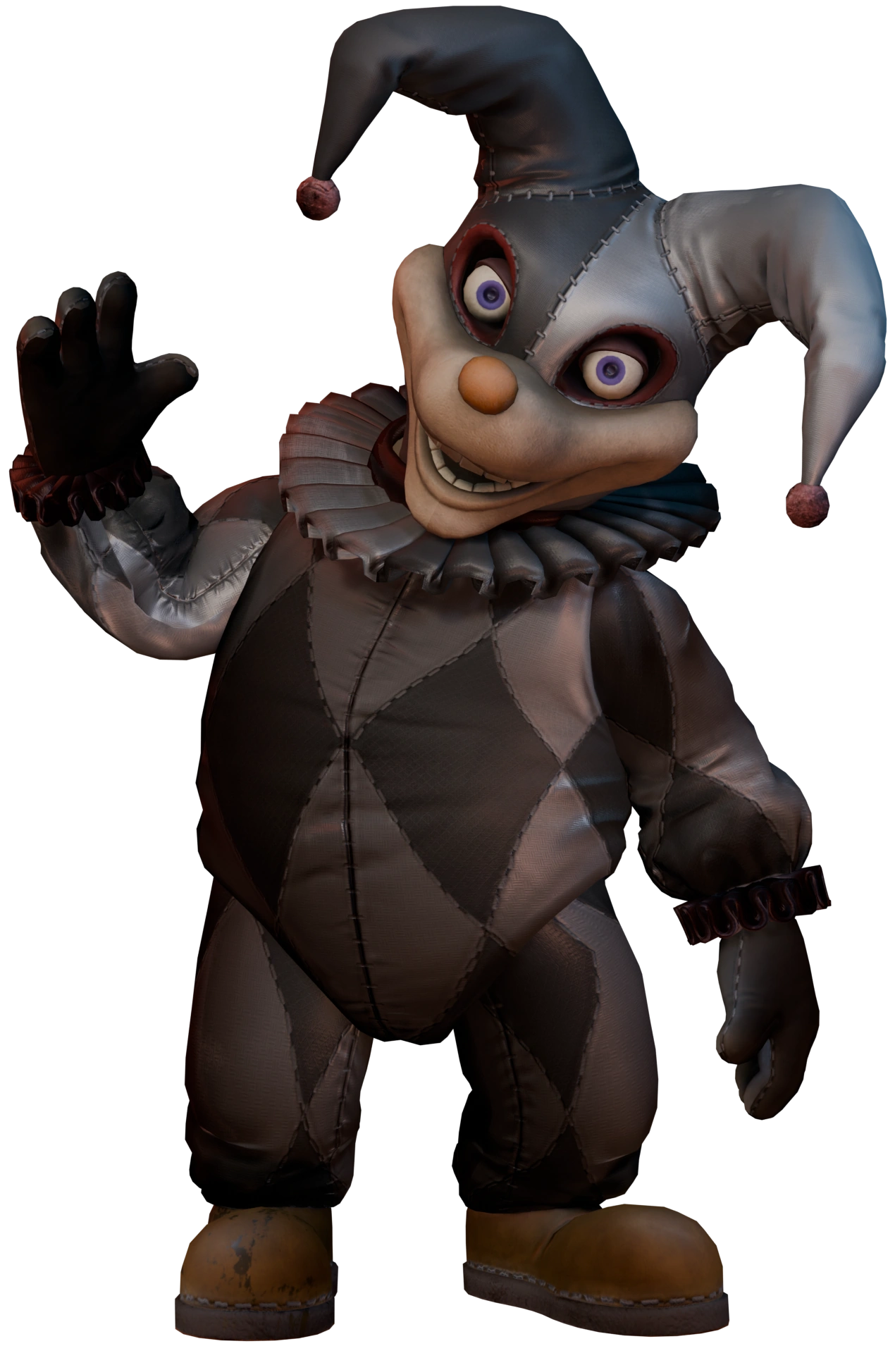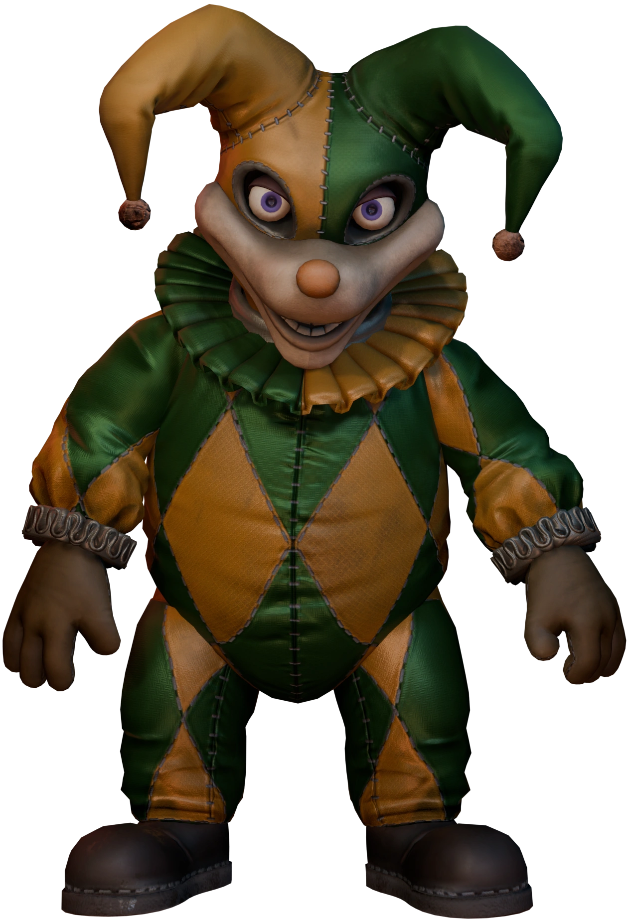 Jester is an unidentified, mouse-like animal dressed head-to-toe in a jester outfit, with a diamond-patterned suit, big clown shoes, and a frilled collar & matching cuffs. Its hands are styled to look like cartoony gloves, and it wears typical jester cap ’n bells hat has two ears with small pom-poms on the ends. The hat doubles as a mask that covers the upper half of the character's face. Said face is stuck in a permanent grin, with a large clown nose and sunken-in, purple eyes.