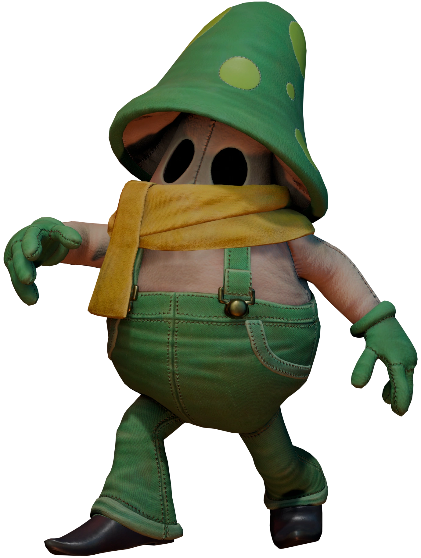 The Mycellium Men share a uniform appearance in being short mushroom men with long arms, a large mushroom cap, overalls and a long yellow scarf around their neck. They also wear large colored gloves, and black pointed shoes. Their mushroom caps are slightly lop-sided, and feature large spots that are the same color as the cap, but lighter in shade. The colors of the Mycellium Men's caps, overalls and gloves change depending on which member of the band is chosen, with the four colors being Light Blue, Red, Pink and Green.