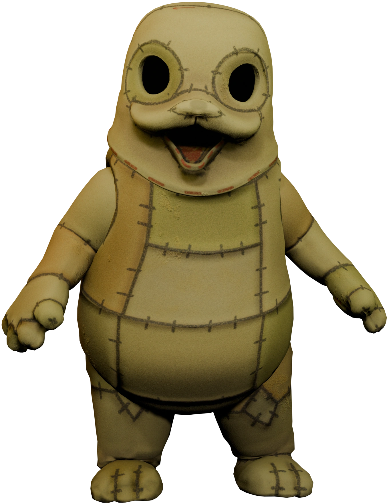 Finally, Hedgehog Hudgie's foam variant follows the same general pattern of all foam suits; being in the general shape of the suit made of stitched together foam pieces that have yellowed over time. Hudgie's suit has multiple bits of red dotted lines along his neck and lower jaw. Uniquely, this foam variation completely lacks Hedgehog Hudgie's recognizable faux-hawk, due to the foam suits lacking most details seen on the finished suits.