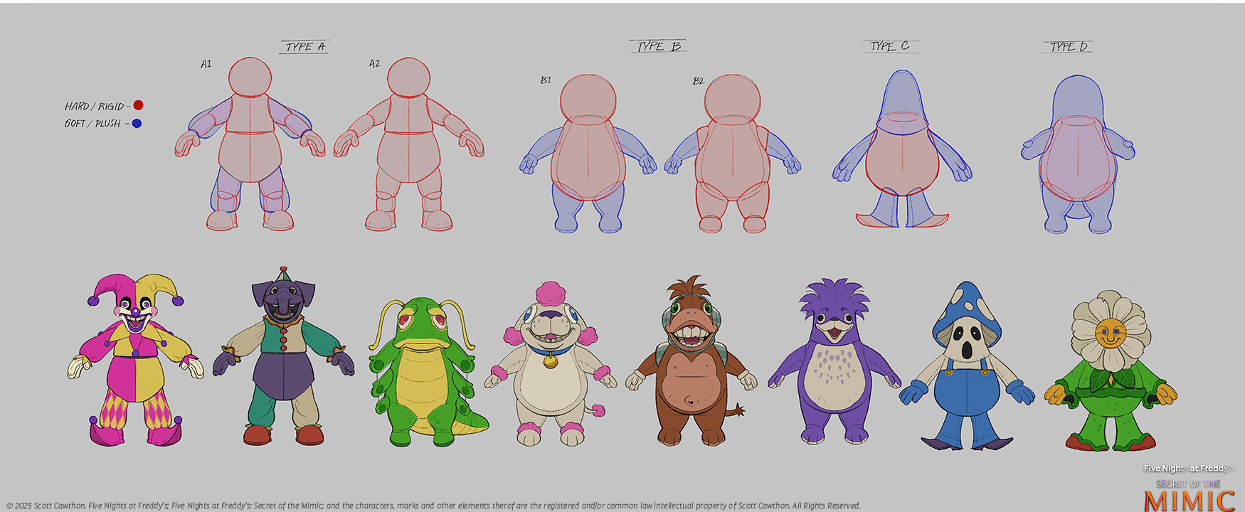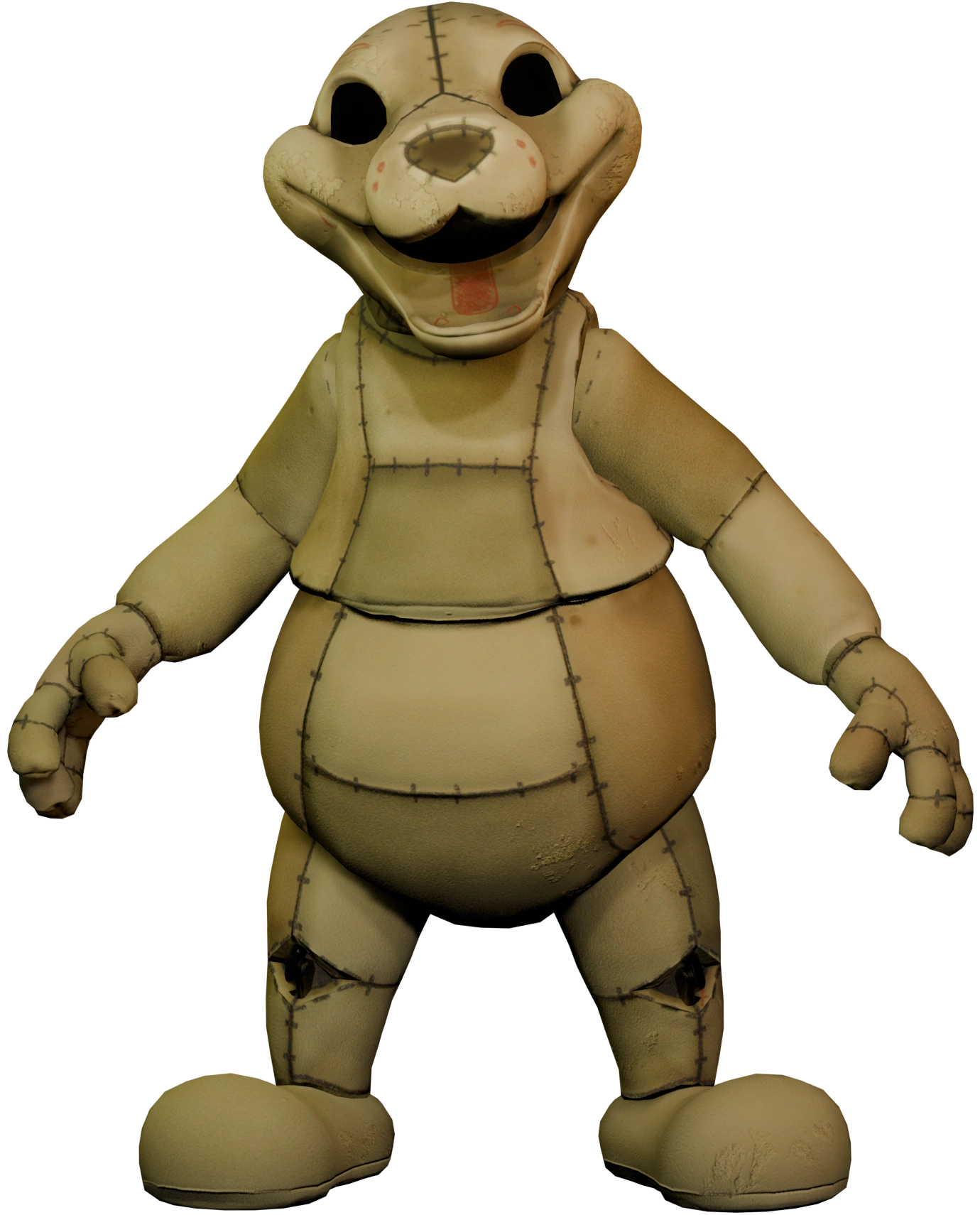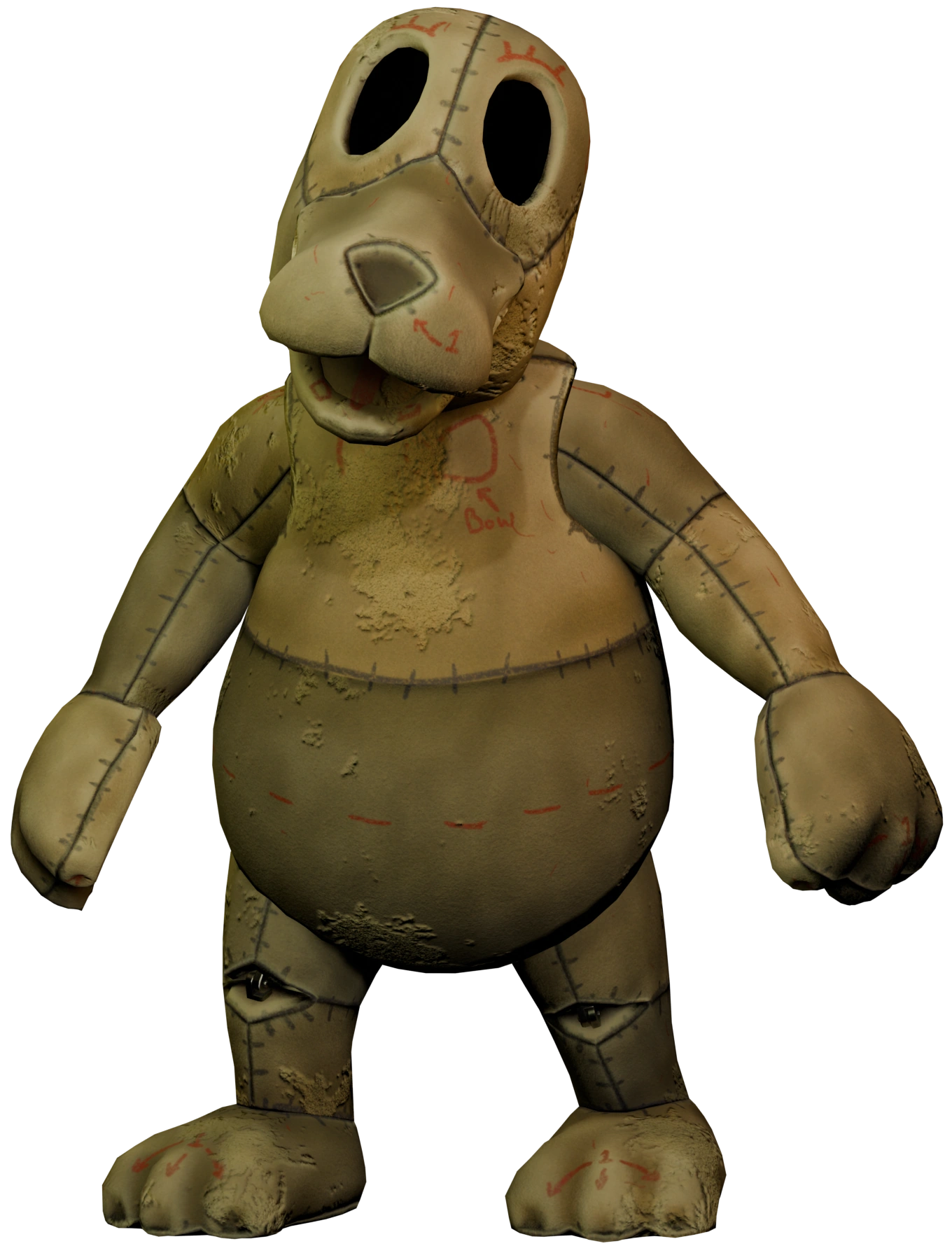 While the mascot suits all hold unique appearances, each suit follows one of three internal body types that determines the suit's animations and general body shape. Each suit has at least three differently colored variants, and all but two suits have unfinished foam variants with revealed endoskeleton joints on the legs and arms. Finally, every single suit, suit variation, and foam suit have dirty/damaged variations that can appear. While the individual dirt stains and tears in suits vary between the character and color of the suit, all include large gray patches of the suit's stuffing being shown, and most of them have the paint on their eyes scratched out.