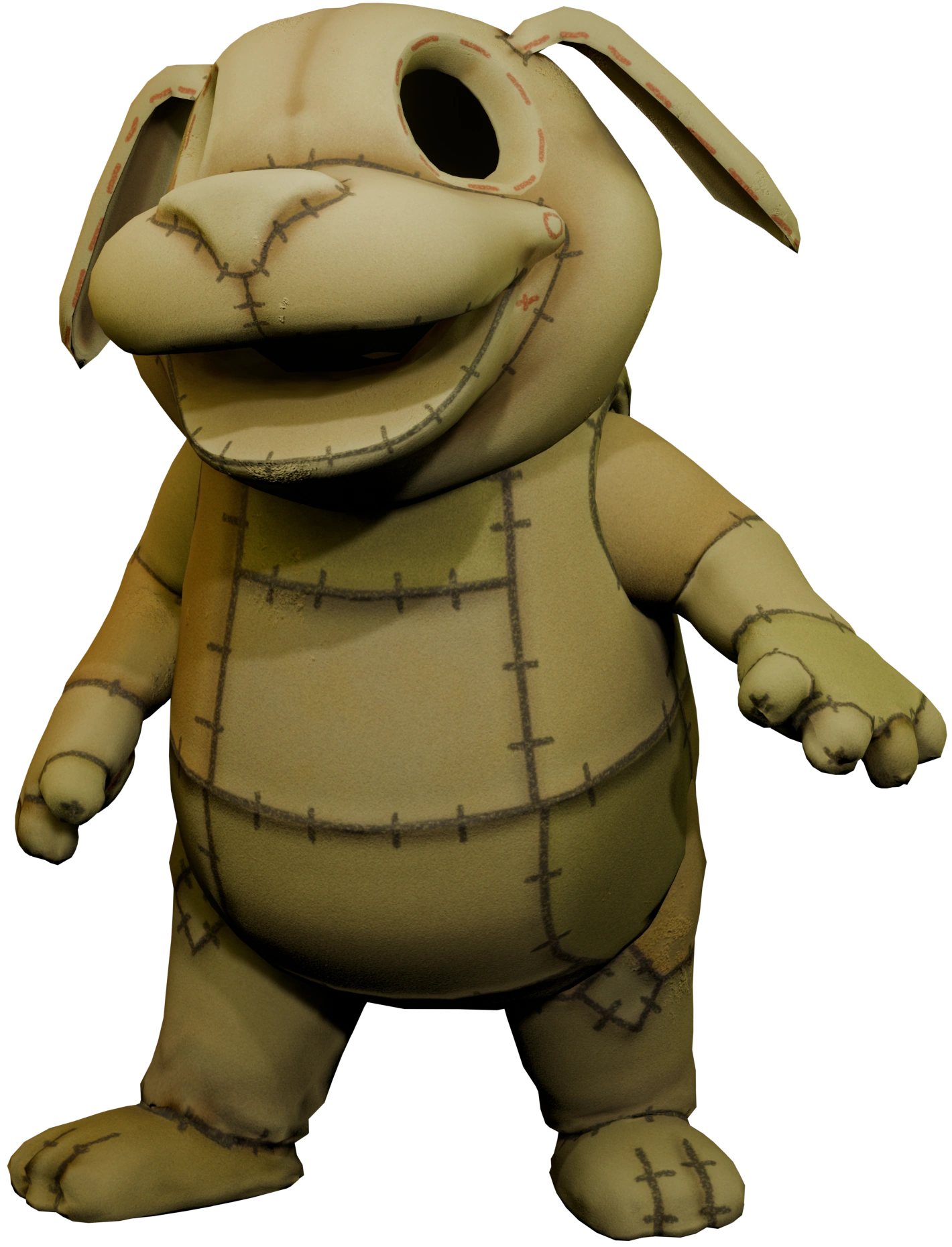 Finally, Elephant has one final variant that the player cannot actually encounter in-game as an enemy. At multiple points throughout MCM, a covered Elephant costume can be found throughout the facility, acting as a static prop. Only the Elephant's ankles are visible, with the remainder of its body being covered by a burlap tarp tied around the Elephant's legs. However, because the ankles are visible, it can be seen that this suit has a unique design to it, wearing light blue pants with turquoise stars on them, and light brown shoes with darker brown toes. The rest of this design is completely unknown, however.