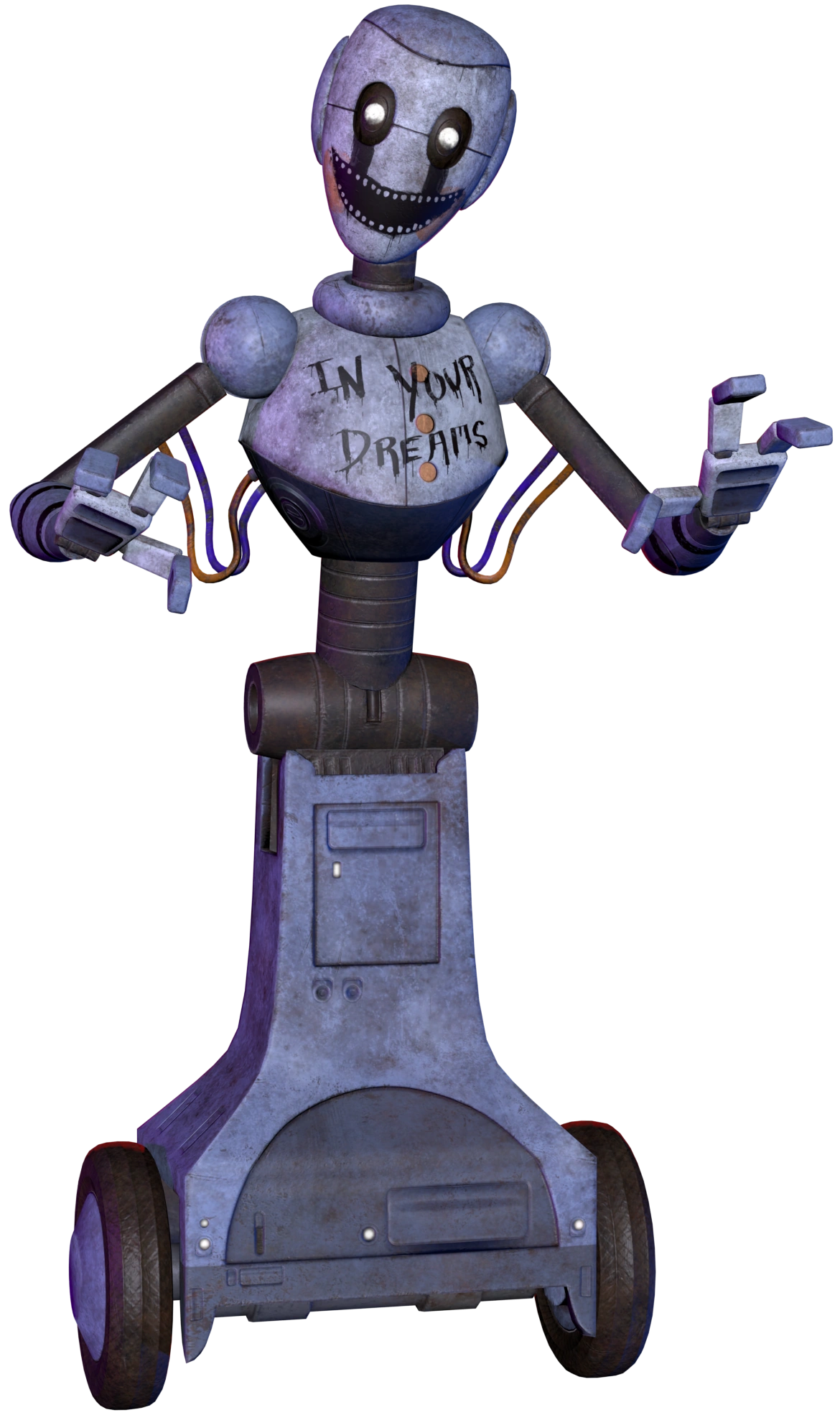 Nightmare Bots appear to have once been regular S.T.A.F.F. Bots, but have been altered. On top of being notably ditier and duller in color compared to their normal counterparts, they now have painted-on smiles with rows of small, sharp teeth. Their arms are dawned with black stripes, and their chest now holds the phrase "IN YOUR DREAMS". Their security variant is identical to them, with the only difference being the addition of the Security hat worn by Security Bots.