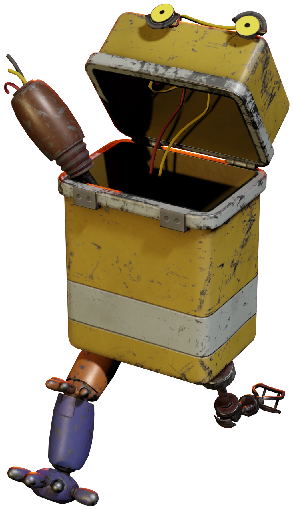 Protomimic D is the only Protomimic model to have variations. Both Protomimic Ds are walking yellow and white trash bins with legs and a tongue made up of an arm sticking out of their open lids. The default variant has two glowing eyes attached to the open lid by a yellow and red wire that can be seen running through its bin body. The "tongue" is made up of a brown suit arm that lacks a hand, having two wires sticking out at the wrist area, that connects to the pelvis piece inside. Its right leg is made up of an orange suit arm and hand as the thigh and a blue suit arm and hand as the shin, with the left leg appearing as a normal endoskeleton leg with the previously seen meat-tenderizer-like item as the foot. Protomimic D2 is mostly identical outside of a few minor differences, the most notable of which being the lack of an upper lid. This variant's tongue is a full blue arm and hand, and its legs have swapped places. Finally, due to lacking a lid like its counterpart, it instead holds a single glowing eye draped over the open top, and a paper plate face similar to Protomimic C's, albeit now with a frown instead of a smile.