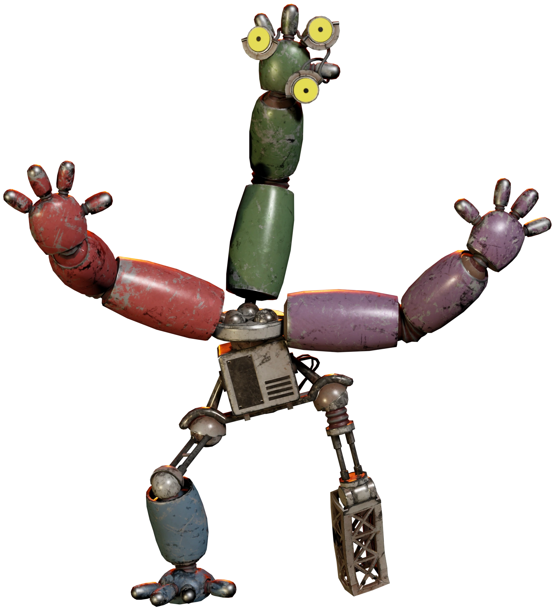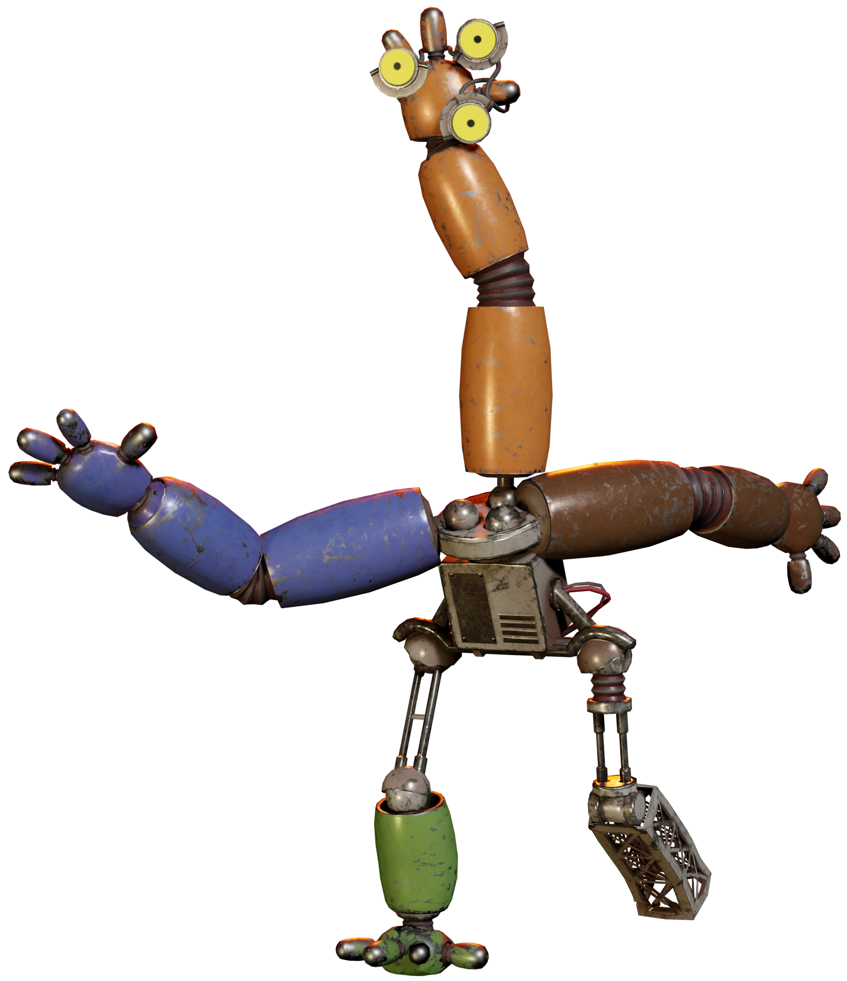 Protomimic C is another single-variant Protomimic like Protomimic A. It's a smaller model that uses a mending plate bent into a circle as a torso with a prototype version of the Mimic's jaw connecting the circle in its center. Its two legs vary slightly, with the right leg having a blue suit piece on its shin, and the left leg lacking a foot and having a slightly different thigh build. Its left arm is made up of the forearm and hand of a blue animatronic suit, and its right arm is made of two metal poles that have glowing eyes attached to the frontside of the upper arm, and where the hand would be. Finally, it has a paper plate for a face with a crudely drawn smiley face reminiscent of the Paperpals.