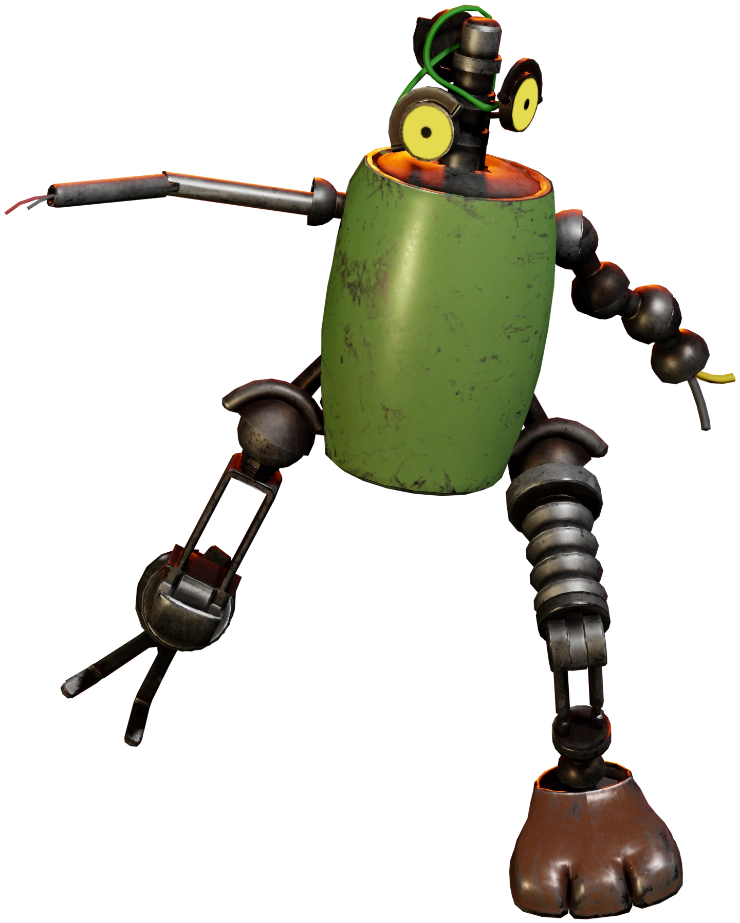 Protomimic A is the simplest, and smallest, of the Protomimics, being a small green limb suit-piece with a small metal pole sticking out the top with three glowing eyes on it attached by a green wire. Each of its limbs are completely different types of endoskeleton limbs, with a thin right arm, a left arm made entirely out of ball joints, a right leg that ends in a two-pronged foot, and a right leg with hydraulic pistons and a small brown animal-like foot piece.