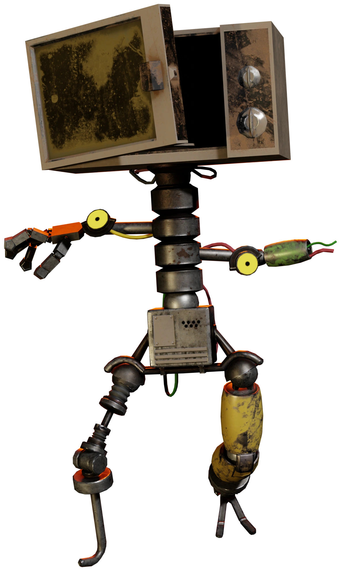 Protomimic E is the final, and most unique, Protomimic model, with its most obvious and noteworthy feature being its microwave head. Its pelvis is made up of the same metallic box piece that made up Protomimic B's torso, but now with a small speaker on it. It also has an endoskeleton arm extending out of the top to act as a connecting torso between the box and "head", acting as a torso. It has two small arms; the right one with an endoskeleton hand and an eye above its elbow, and the slightly lower-placed left one having a small broken green suit piece with wires sticking out and another eye just above the elbow. Its right leg is that of an endoskeleton leg with a bent metal rod as a foot, and its left leg is a yellow suit piece with a two-pronged foot seen on many other Protomimics.
