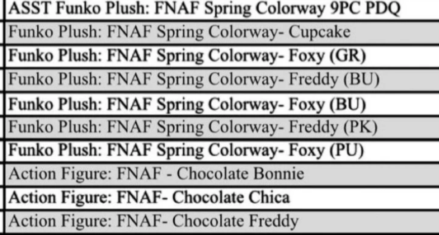 The first Funko plushie for FNaF AR: Special Delivery was Freddy Frostbear, revealed alongside an action figure for him. The Frostbear action figure was the first to be released, and was actually leaked on Ebay where they began selling them for $65.00 a piece. As well as this, multiple plushies for the new "Spring Colorway" animatronics were revealed to be coming soon. Eventually, the Spring Colorway set was revealed alongside figures for Chocolate Bonnie, Easter Bonnie and the new Chocolate Freddy and Chocolate Chica.