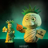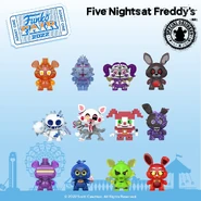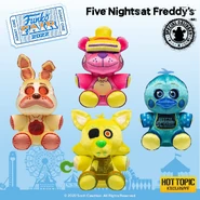 A wave of merch for the Arcade Mayhem and Wasteland skins were leaked, and later found in early February of 2022. Each figure was a glow-in-the-dark figurine, and a set of mystery minis for the same five characters were also revealed. Later, they were properly advertised on February 16th, along with the reveal of plushies and keychain pop figures for the set of characters, as well as plushies and figures for VR Toy Freddy's attack mode, Shamrock Freddy and Chocolate Freddy. The final merch revealed for this wave were "Inverted" plushies for the Arcade Mayhem skins and Radioactive Foxy, as well as a set of mystery minis featuring the Arcade Mayhem Skins, Wasteland Skins, 8-Bit Baby, the Heart Stoppers skins, Arctic Ballora, Frostbite Balloon Boy and Mangle. Later on May 24, 2022, a plushie for Liberty Chica was revealed to release, and was later officially revealed by Funko on July 6, alongside a Liberty Chica action figure. Much later after the wave had seemingly finished, an Arctic Ballora action figure and Frostbite Balloon Boy plush were revealed.