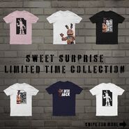 The Sweet Surprise Limited Edition Collection is a series of T-shirts and hoodies featuring Chocolate Bonnie. The collection launched on June 23rd, 2020. In addition, VIPs who had signed up for early access will have exclusive access two hours before its launch. This collection only has limited quantities available.