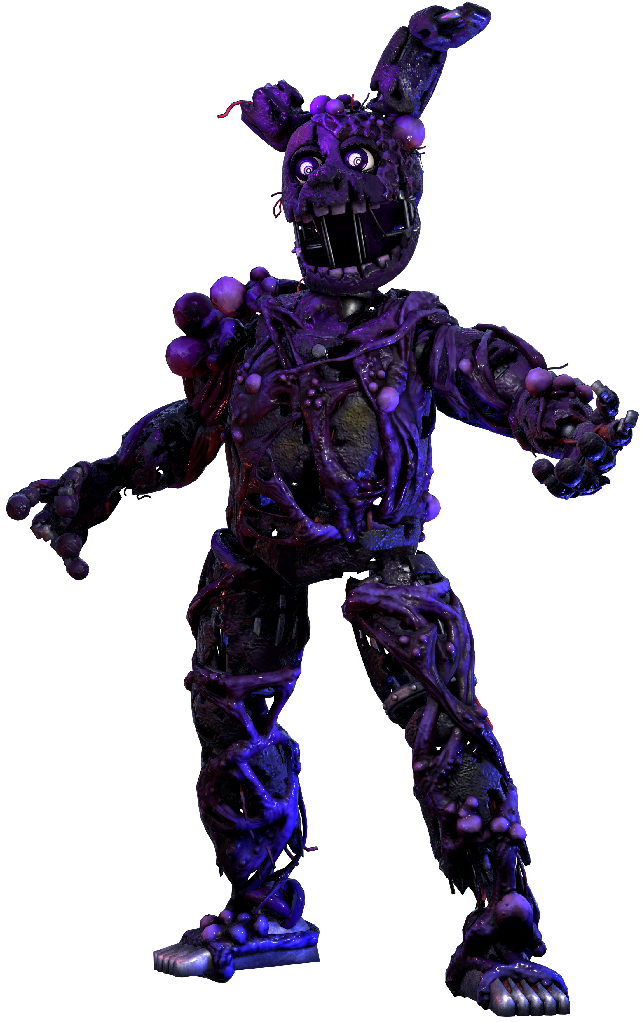 Toxic Springtrap has a repulsive appearance, covered in pale tumor-like warts, tentacle-like veins, some moldy skin patches, and exude gassy fumes. The infectious-looking traits, including his corpse, were shaded with purple and indigo tints as a possible reminiscent to the iconic color of his human form's minigame appearance.