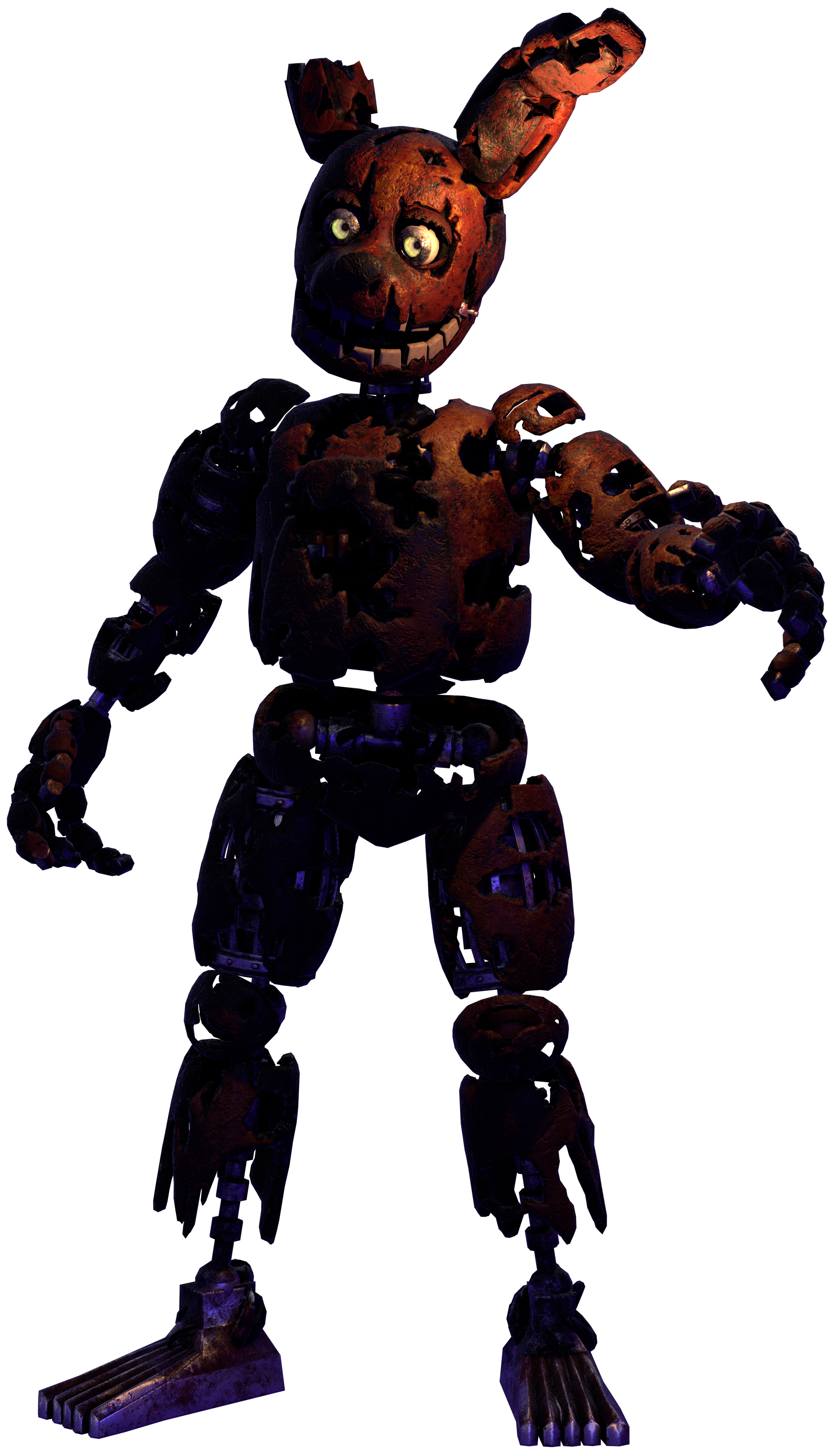 Springtrap is a tattered, formerly yellow springlock animatronic rabbit with olive green tints, notably on his stomach and ear insides. Like with the withered animatronics from FNaF 2, Springtrap appears to be in heavy disrepair, evident by the multiple tears throughout his body and wires poking out of his arms and legs. He has one black button on his chest. Furthermore, Springtrap contains several pieces of human innards wrapped around his body. Upon close inspection, it is revealed that Springtrap is holding the corpse of William Afton, the man responsible for the Missing Children Incident.
